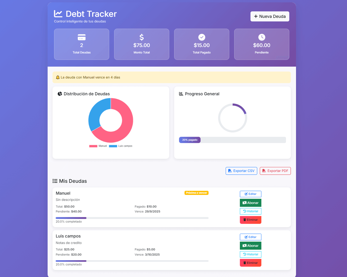 Aprende a implementar un pequeño sistema que registra deudas, permite registrar abonos y muestra el progreso general y por deuda. El código usa Bootstrap 5, Chart.js para gráficos y jsPDF para exportar en PDF.