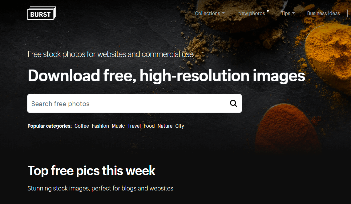 Burst es una plataforma de fotos de archivo gratuita que funciona con Shopify. Utiliza estas fotos gratuitas en tu tienda en línea, en el embalaje del producto o en cualquier otro lugar que desees. La biblioteca fue creada y curada para las tiendas de Shopify , por lo que es un recurso útil para los comerciantes en línea, con categorías como compras, días festivos, alimentos, joyas y productos.